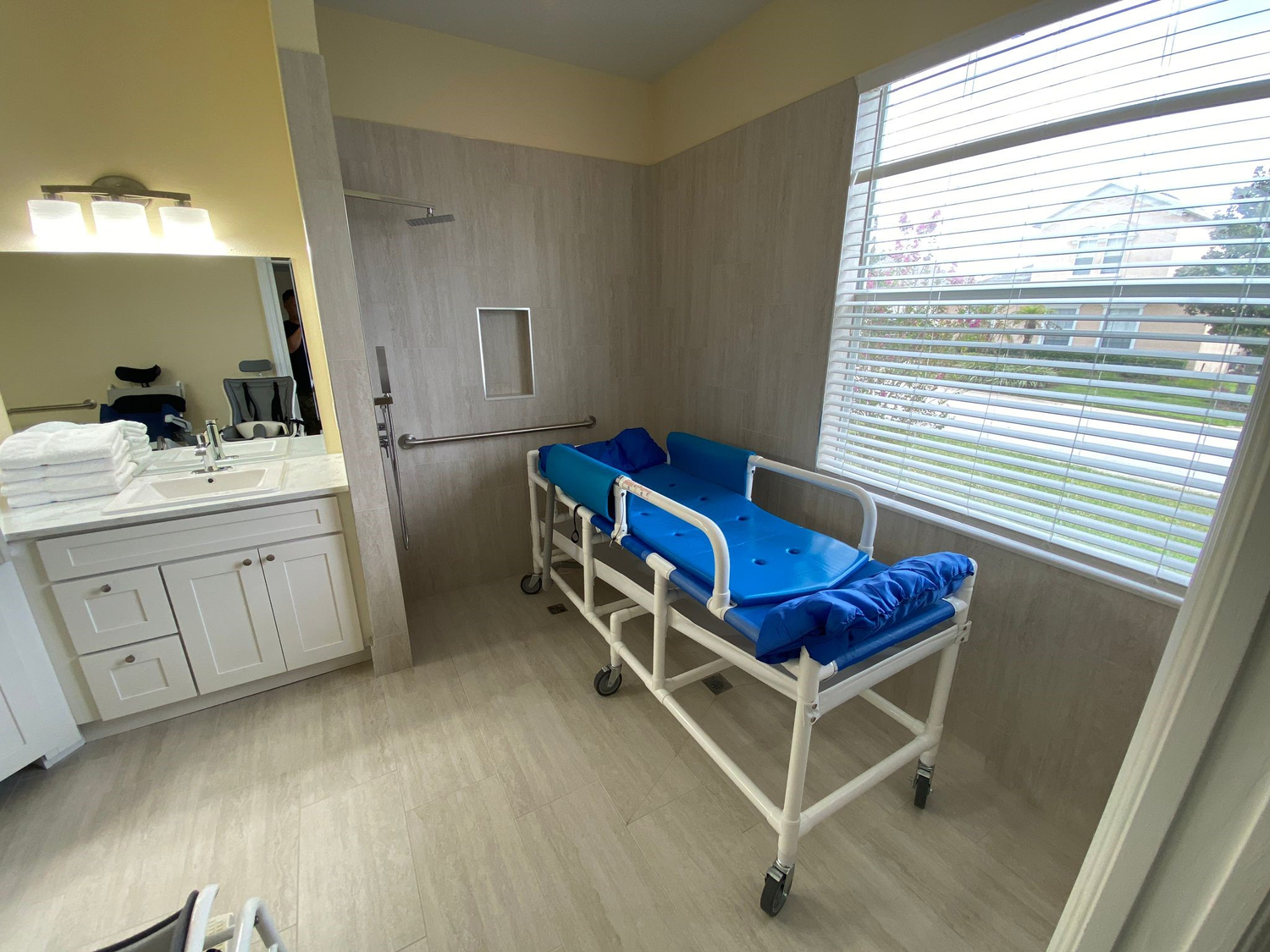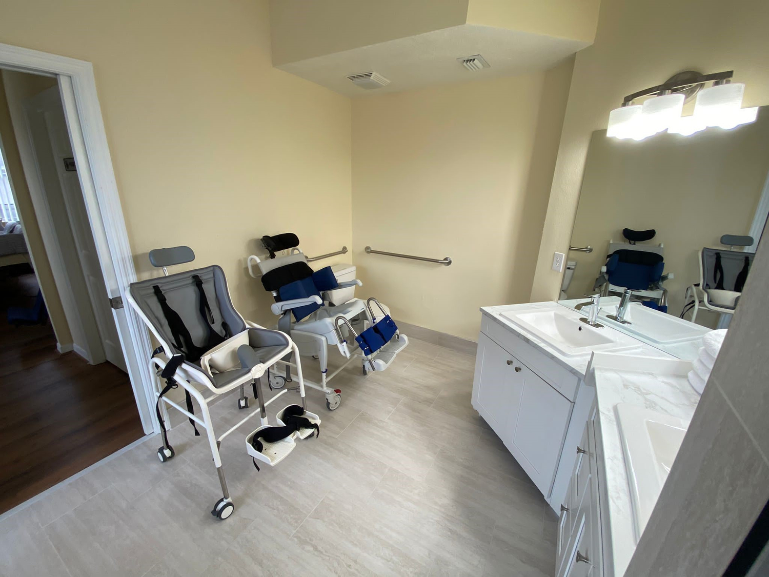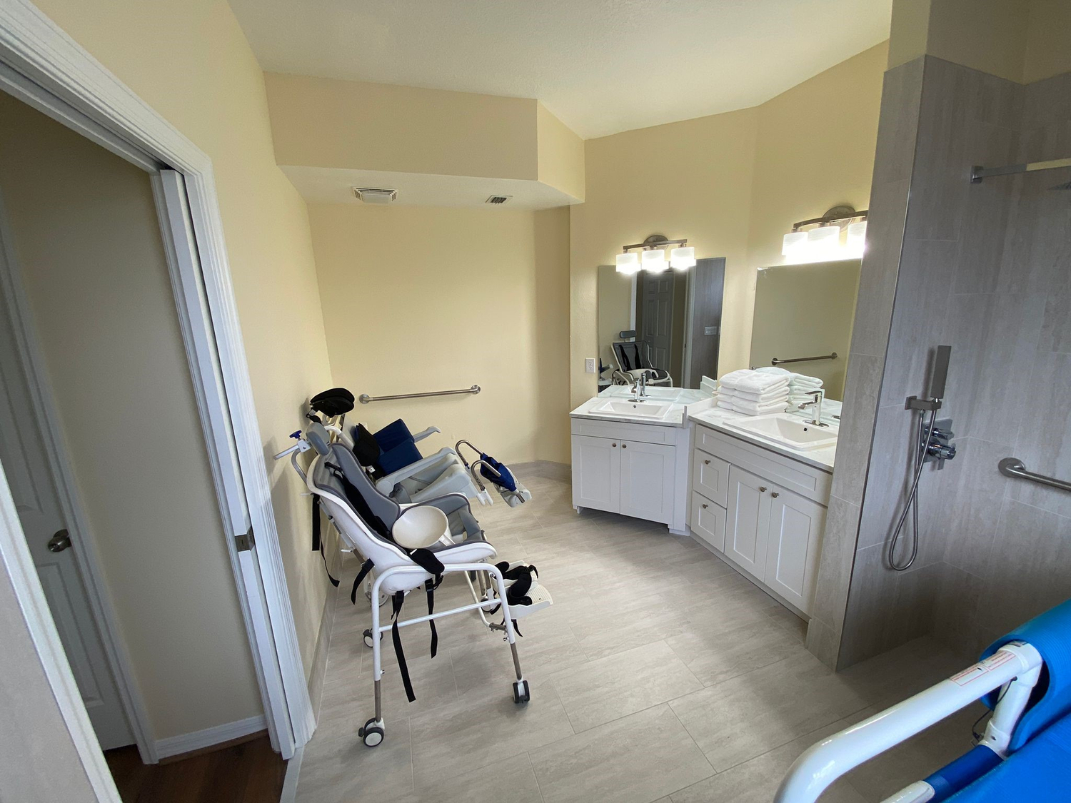 Wet Room/Bathroom - Level access. Two sinks, one carer's height and one wheelchair height. Lay down shower bench, two commodes, one adult sized and one child sized. Grab rails. All equipment is fully mobile to the gantry. Extendable shower hose for use with the shower bench.