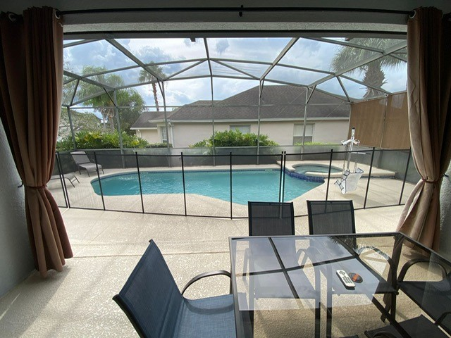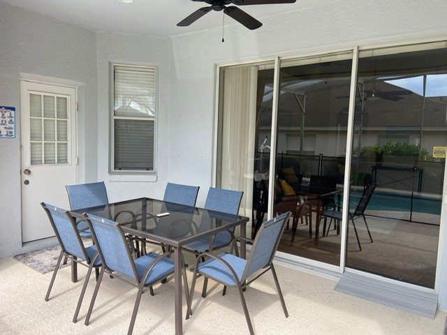 There is an additional patio table and chair set on the pool deck under the shaded lanai for alfresco meals and barbecues.