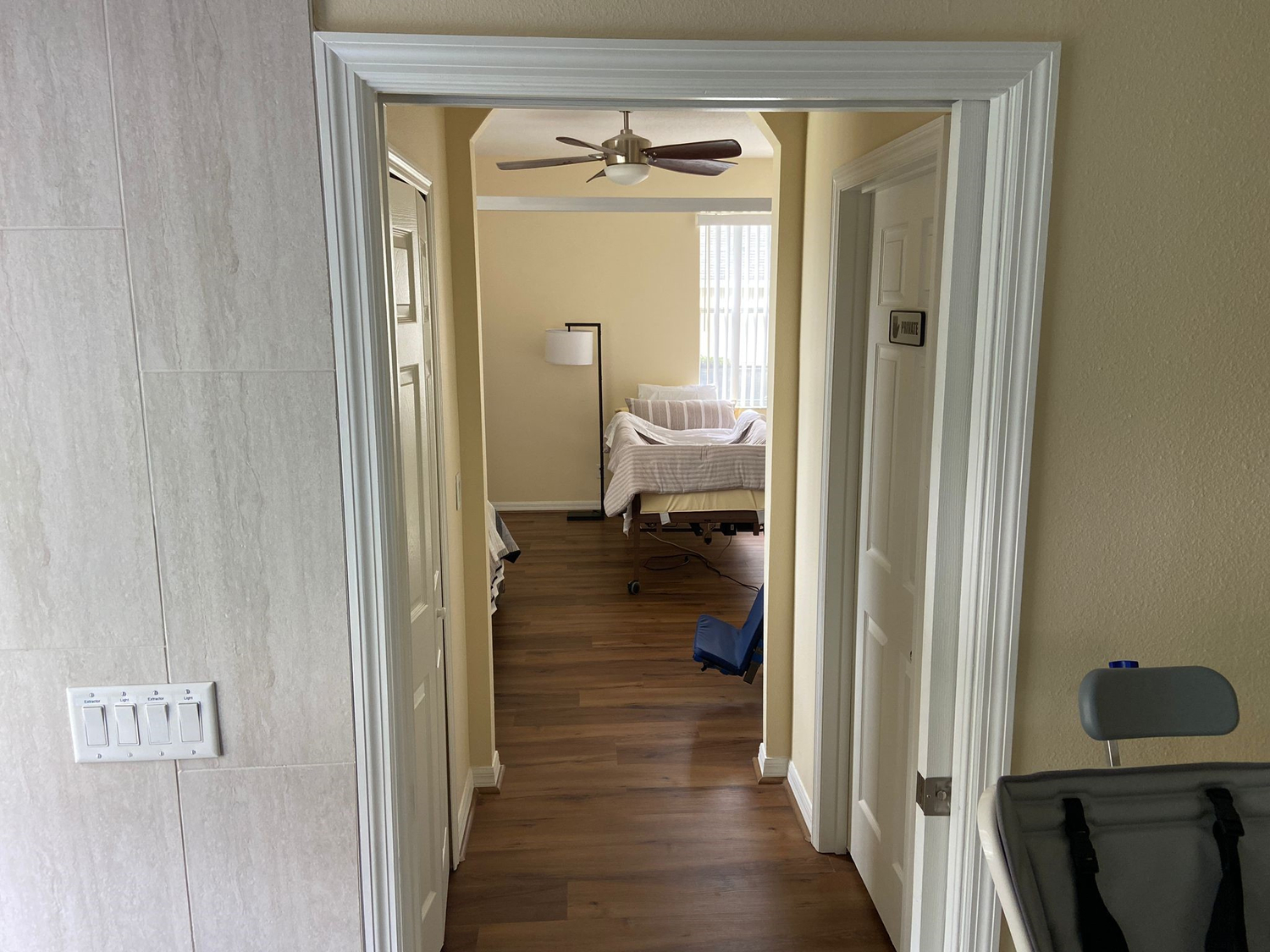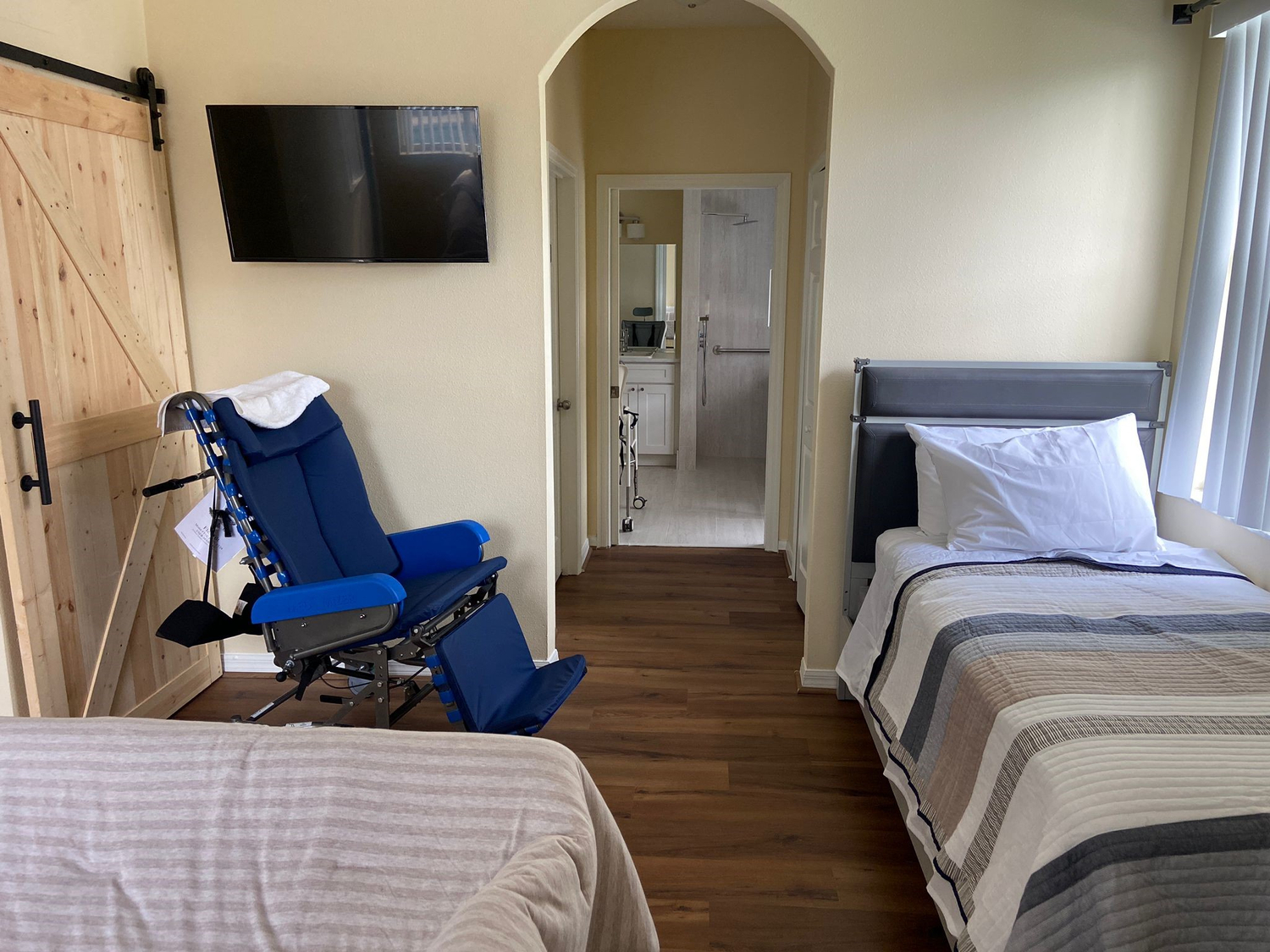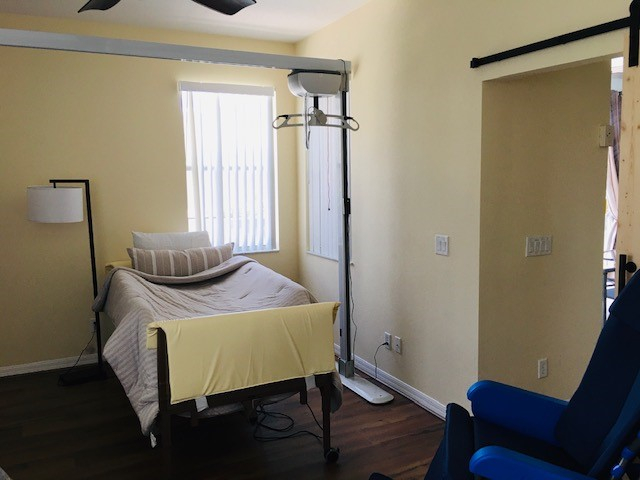 The Largest Bedroom is the adapted master suite - Profiling hospital bed, height adjustable. Overhead gantry hoist. Manual pump mobile hoist (emergency use/preference). Carers bed if required. Big turning circle. Wall mounted TV for viewing from the hospital bed. Comfy chair - tilt in space and recline. Wheelchair friendly flooring leads to a Wet Room/Bathroom.
