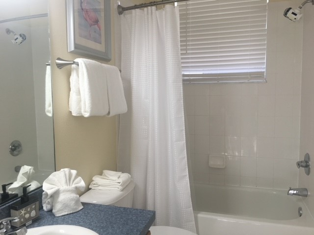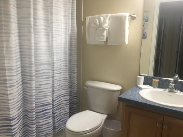 King Bedroom En-suite bathroom - Full bathroom with bath/shower combo, single vanity sinks and toilet.
