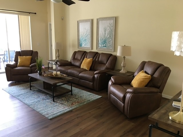 Family Room - Non carpeted to provide easy access for wheelchairs and equipment. All sofas and chairs are reclining. Large screen tv. Ramped access to the pool area.