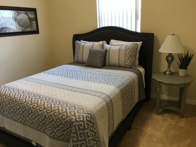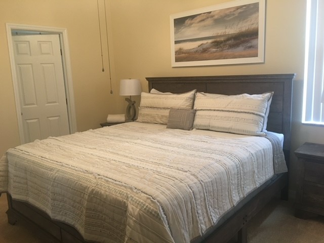 Master 2 - Carpeted. king bedroom with en-suite bathroom and access to the pool area.