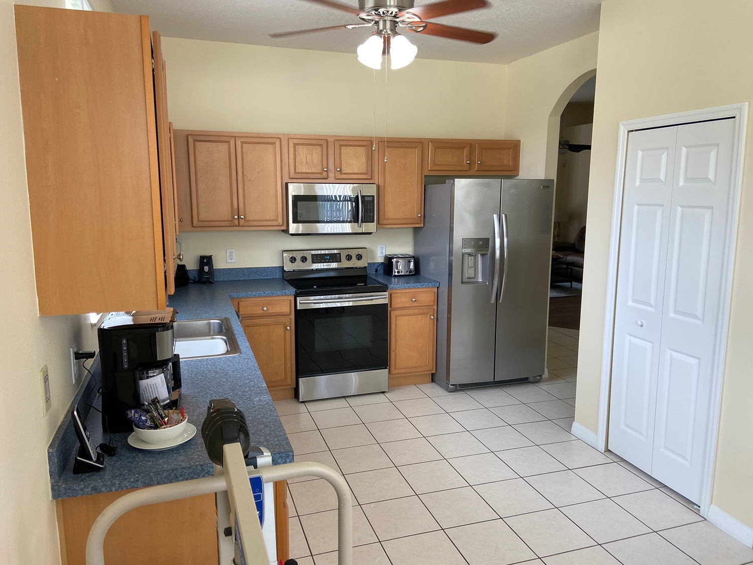 Kitchen/Breakfast Room - Spacious wheelchair friendly room with tiled floor. Accesible via the front door with level access for wheelchairs. All stainless-steel appliances. Vitamix blender for use for blended diets. Appliances include, large refrigerator/freezer, top oven, microwave oven and dishwasher.