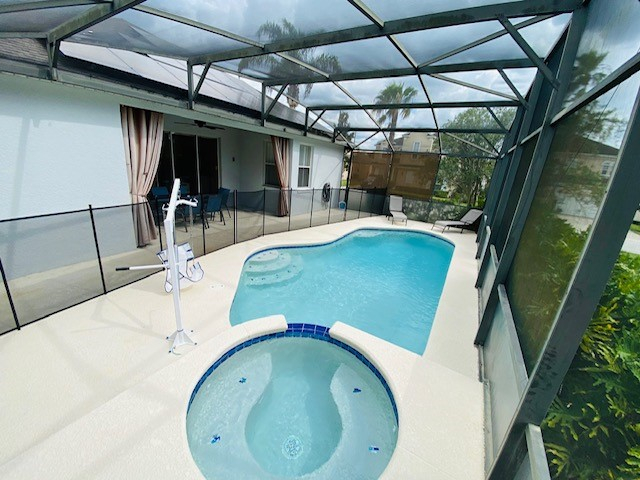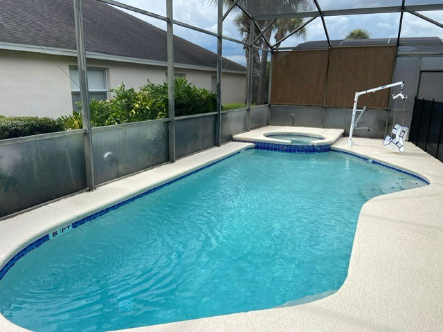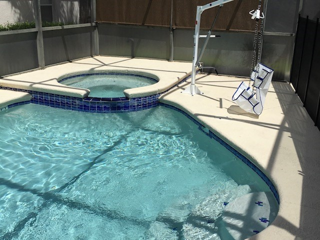 Pool - A sunny pool and spa with sun loungers and a shaded lanai area. Pool hoist with changeable sling for use in the pool and spa. Guests can use their own fitted sling but must replace the general one provided at the end of their stay.