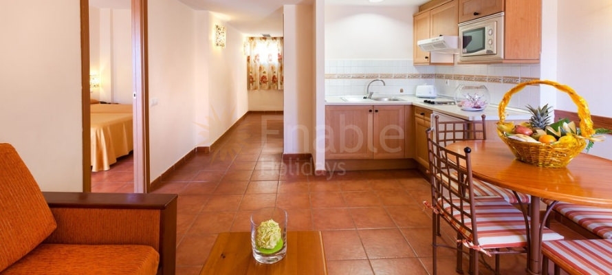 Each of the five accessible apartments has a fully fitted kitchen with hob, kettle, microwave, fridge, and utensils. There is also a comfortable sofa-bed with a separate bedroom and two single beds, and a large, furnished balcony.