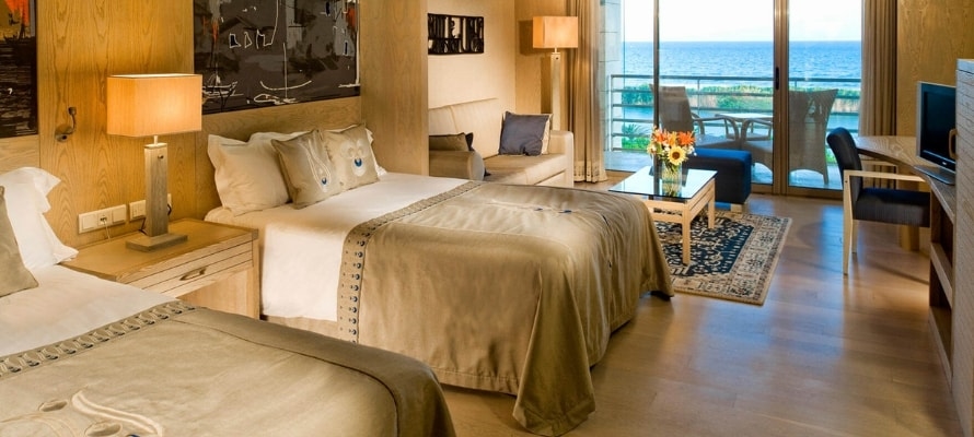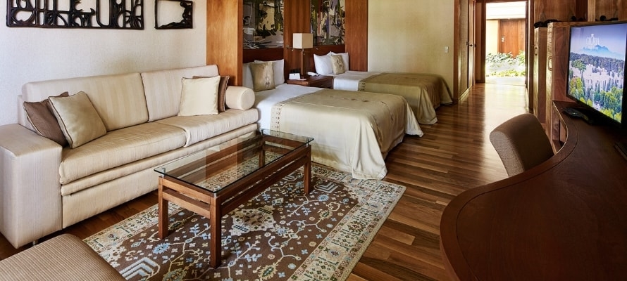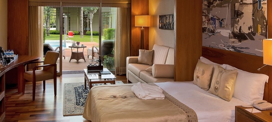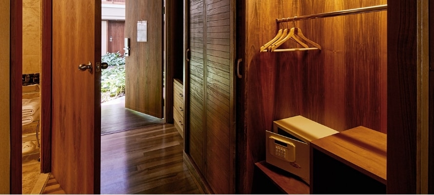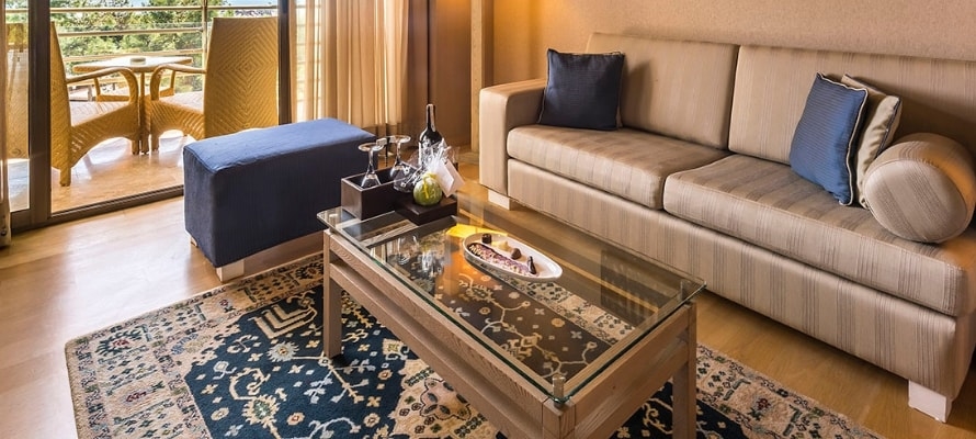 Garden or pool view, terrace or balcony, parquet flooring, sofa, tea & coffee making facilities, kettle, bathrobe, slippers, phone, bathroom phone, safe, tv, air conditioning, minibar, WiFi, cosmetic mirror, hairdryer, DVD player (on request), key card system