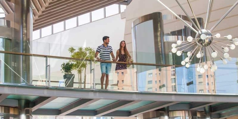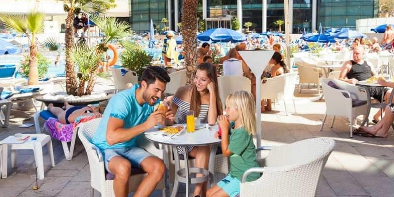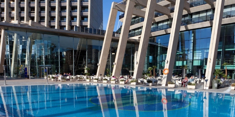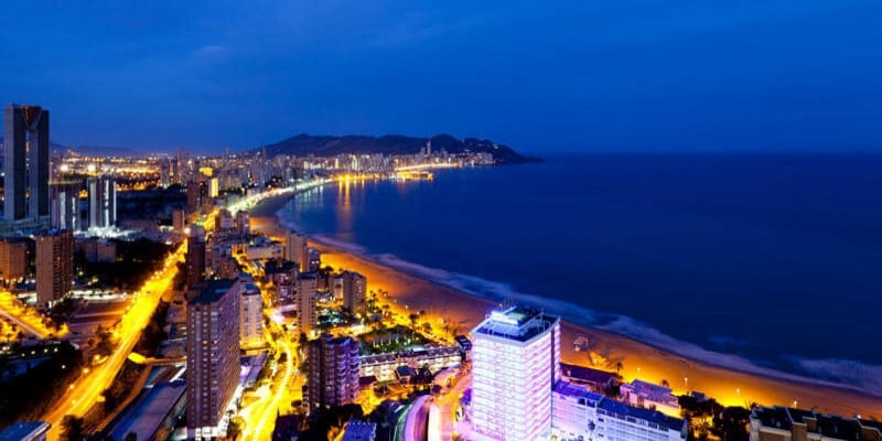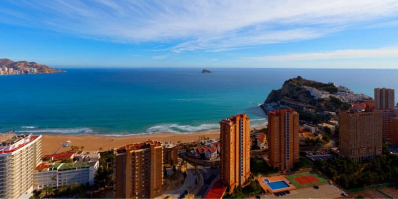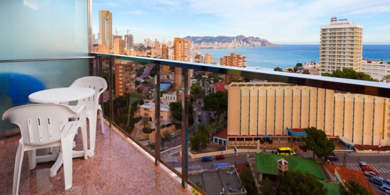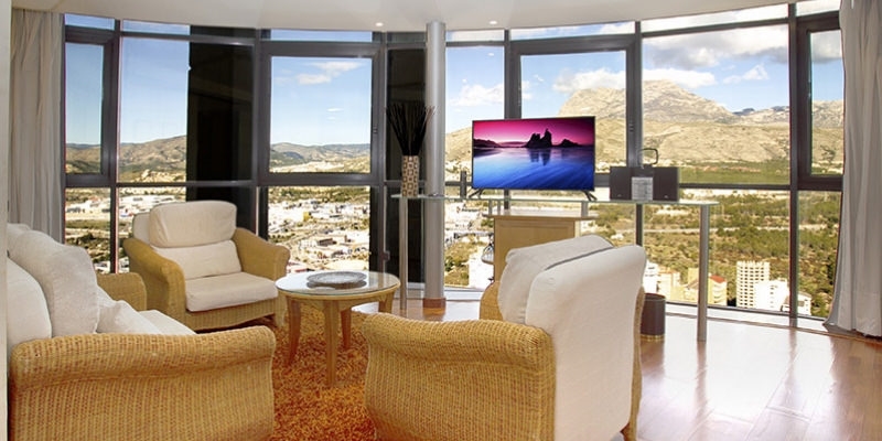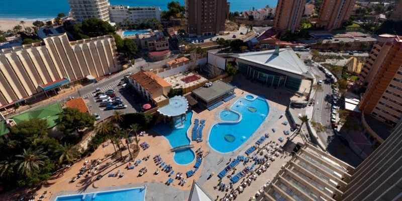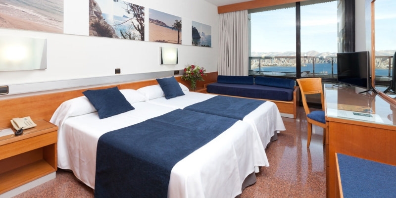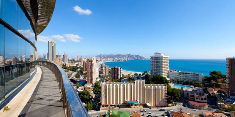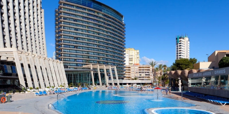 Situated at the Poniente side of Benidorm, at the further end of the beach in a quiet area but with bars, restaurants, and cafés in the vicinity, this is the tallest hotel in Benidorm and boasts a rooftop observatory that is free to guests.