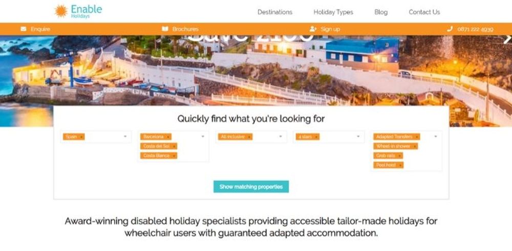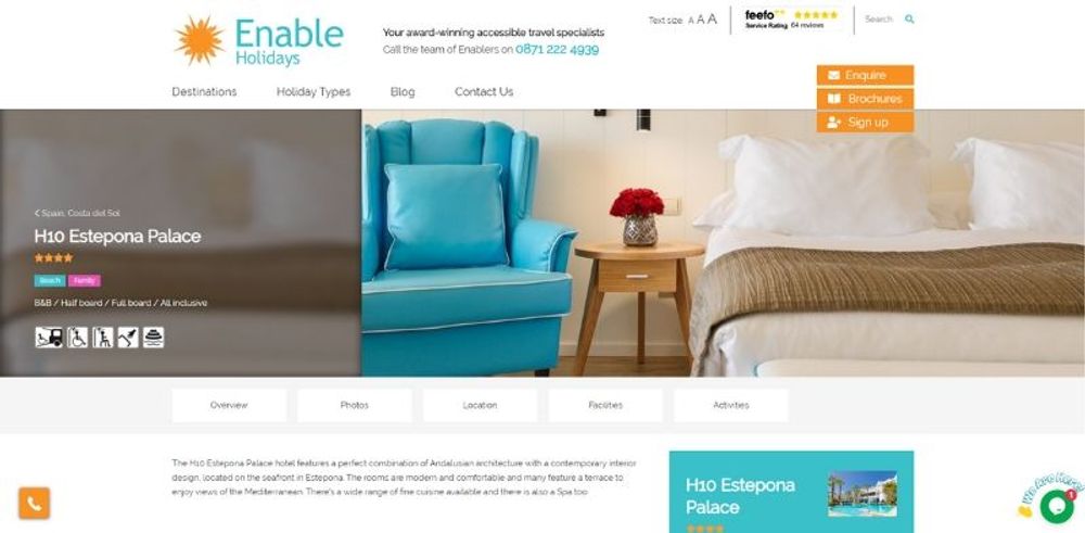 A live chat feature is also available on this new and improved website, sitting on the right side of every page opposite our callback button. This chat provides a direct link to the Enable team, allowing customers to get answers to any questions they may have, regarding accessible holidays, in real-time without having to wait long for a response or requiring them to visit an external source.